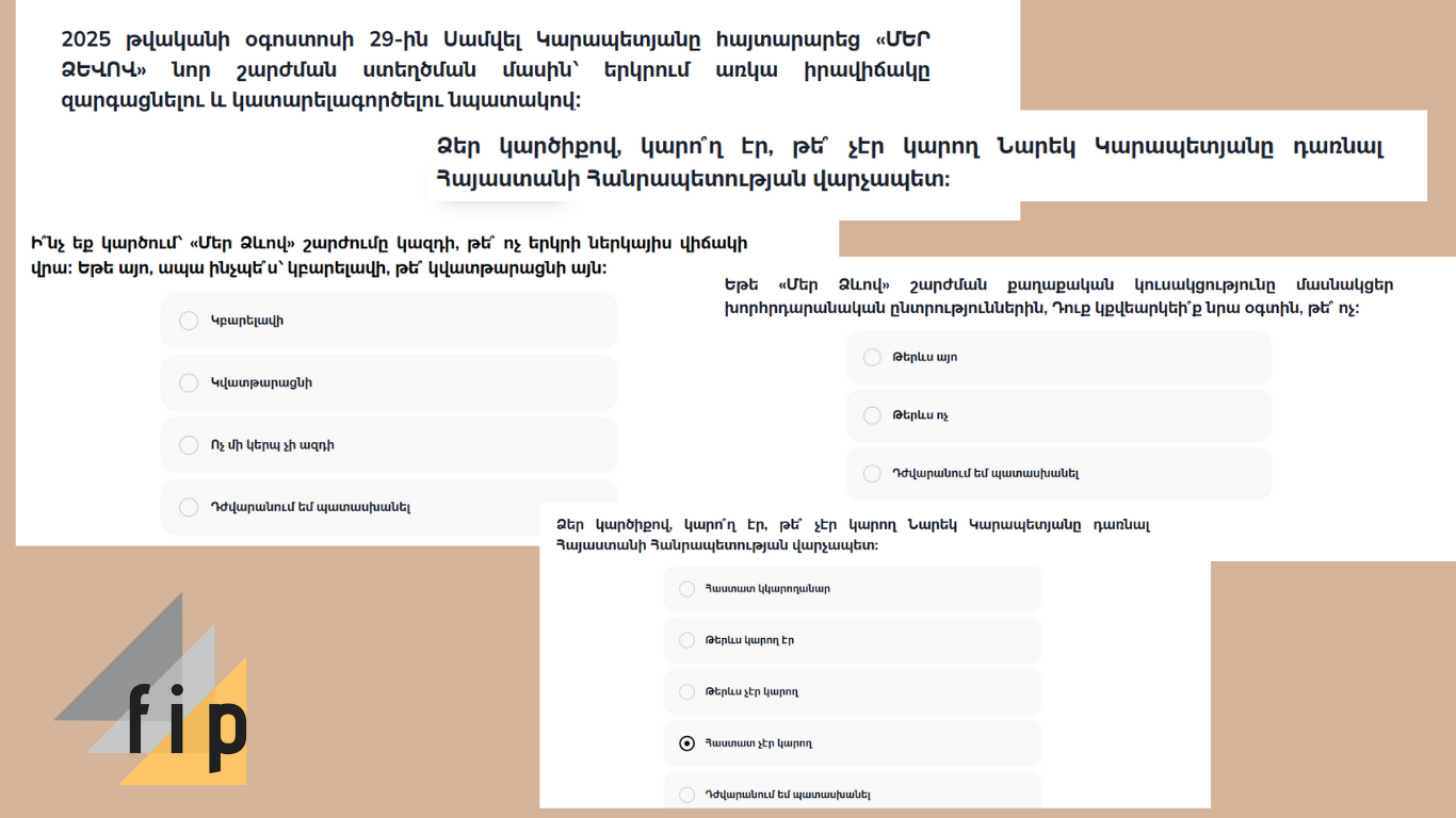 FIP.am-ի ուսումնասիրության ընթացքում ակամա դարձանք հարցման մասնակից․ հարցման կառուցվածքը, հարցերի բովանդակությունը և դրանց տրամաբանական շարունակականությունը համընկնում են «Մեր ձևով» շարժման քաղաքական օրակարգի հետ։