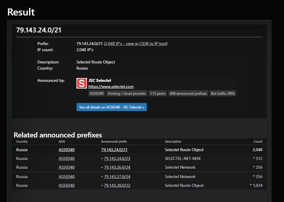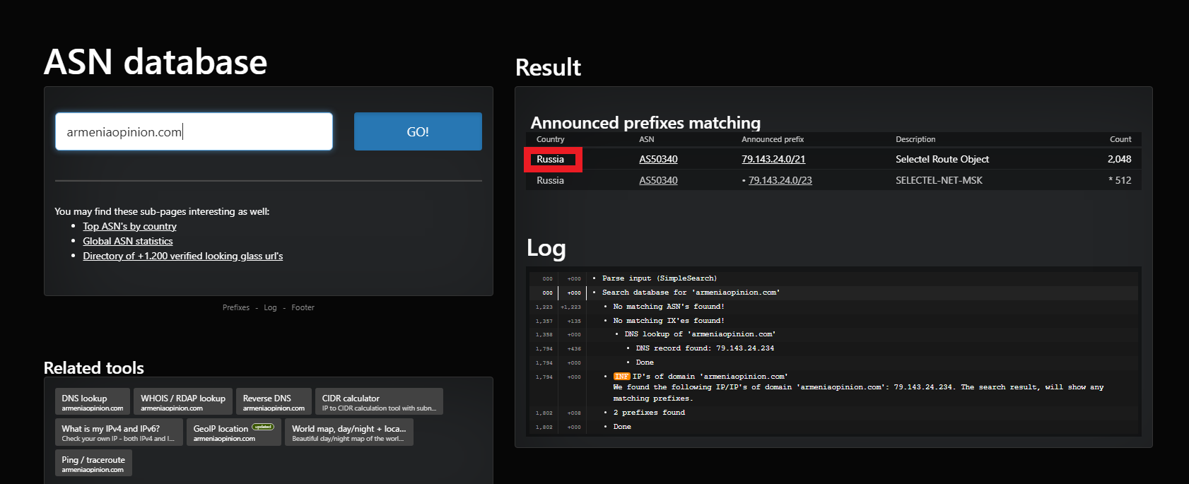 DNS Lookup-ը ցույց է տալիս, որ armeniaopinion.com-ի փրովայդեր Selectel ընկերությունը գտնվում է Ռուսաստանում։