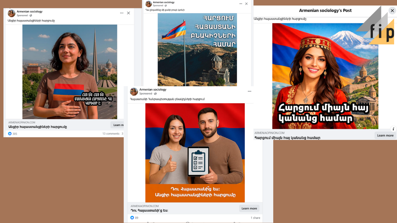 Այսպիսով, FIP.am-ի ուսումնասիրությունը ցույց է տալիս, որ ֆեյսբուքում գովազդվող սոցհարցումները տարածվում են անհայտ և հանրային գործունեությամբ աչքի չընկնող էջերի միջոցով։ Այդ հարցումների բովանդակությունն ու կառուցվածքը ուղղված են կոնկրետ քաղաքական ուժի և գործչի հանրային ընկալումների ուսումնասիրմանն ու ձևավորմանը, իսկ դրանց իրական պատվիրատուների մասին բաց տեղեկություն չի ներկայացվում։