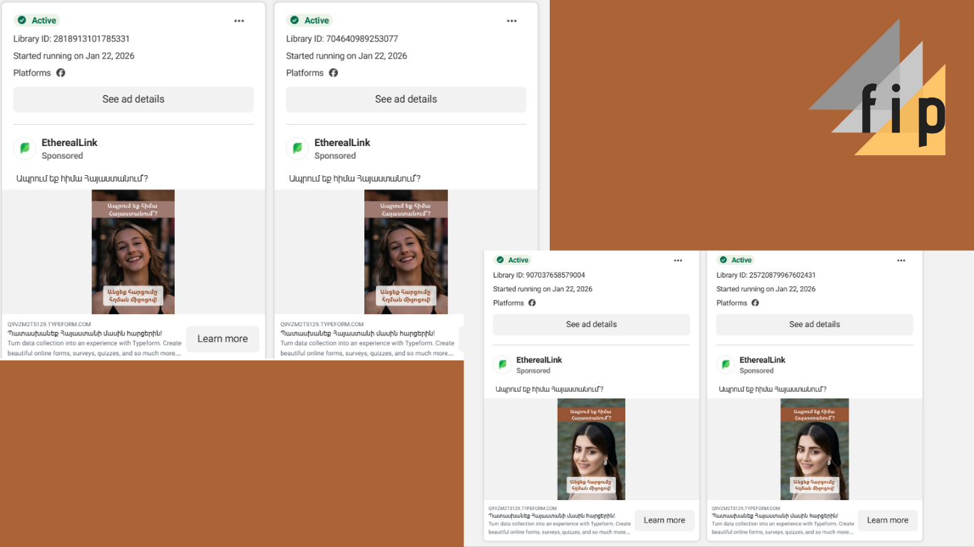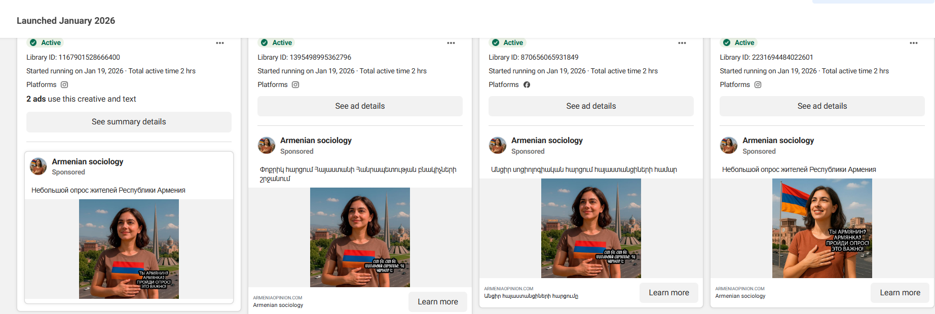 Անհայտ էջերի գովազդները ակտիվ են Meta Ad Library-ում և ունեն տարբեր Library ID-ներ, ինչը նշանակում է, որ դրանք մասշտաբային, ոչ պատահական արշավներ են։