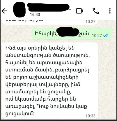 Աշխատանքային օրս ավարտվեց տնօրենիս անունից WhatsApp-ով ստացած հաղորդագրությամբ։ Նա գրում էր, որ իրեն կանչել են Հայաստանի ազգային անվտանգության ծառայություն, տեղեկացրել կազմակերպության աշխատակիցների արտահերթ ինչ-որ «արտապլանային ստուգման» մասին և փոխանցել այն աշխատակիցների ցանկը, որոնց հետ կապված հարցեր են առաջացել։