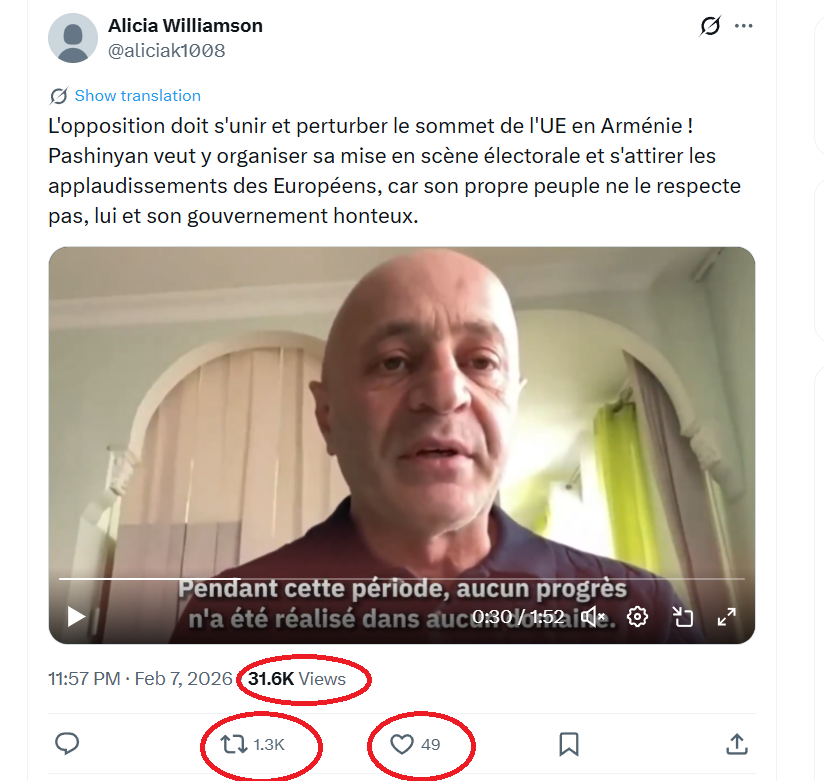 Ուսումնասիրելով X (Twitter) հարթակում նյութը տարածած հաշիվը՝ նկատելի է, որ այն ունի ոչ օրգանական վարքագծի հատկանիշներ․ հաշիվը գրեթե չունի անձնական բովանդակություն, երկար ժամանակ գործուն չի եղել, իսկ ակտիվացել է բացառապես Հայաստանի ներքաղաքական թեմաներով տեսանյութերի տարածմամբ։ Այդ տեսանյութերում մեղադրանքներ են հնչեցվում Հայաստանի կառավարության հասցեին, իշխանությունները մեղադրվում են կոռուպցիայի մեջ։ Գրառումը 30 հազարից ավելի դիտում է ունեցել ու բազմաթիվ տարածում։