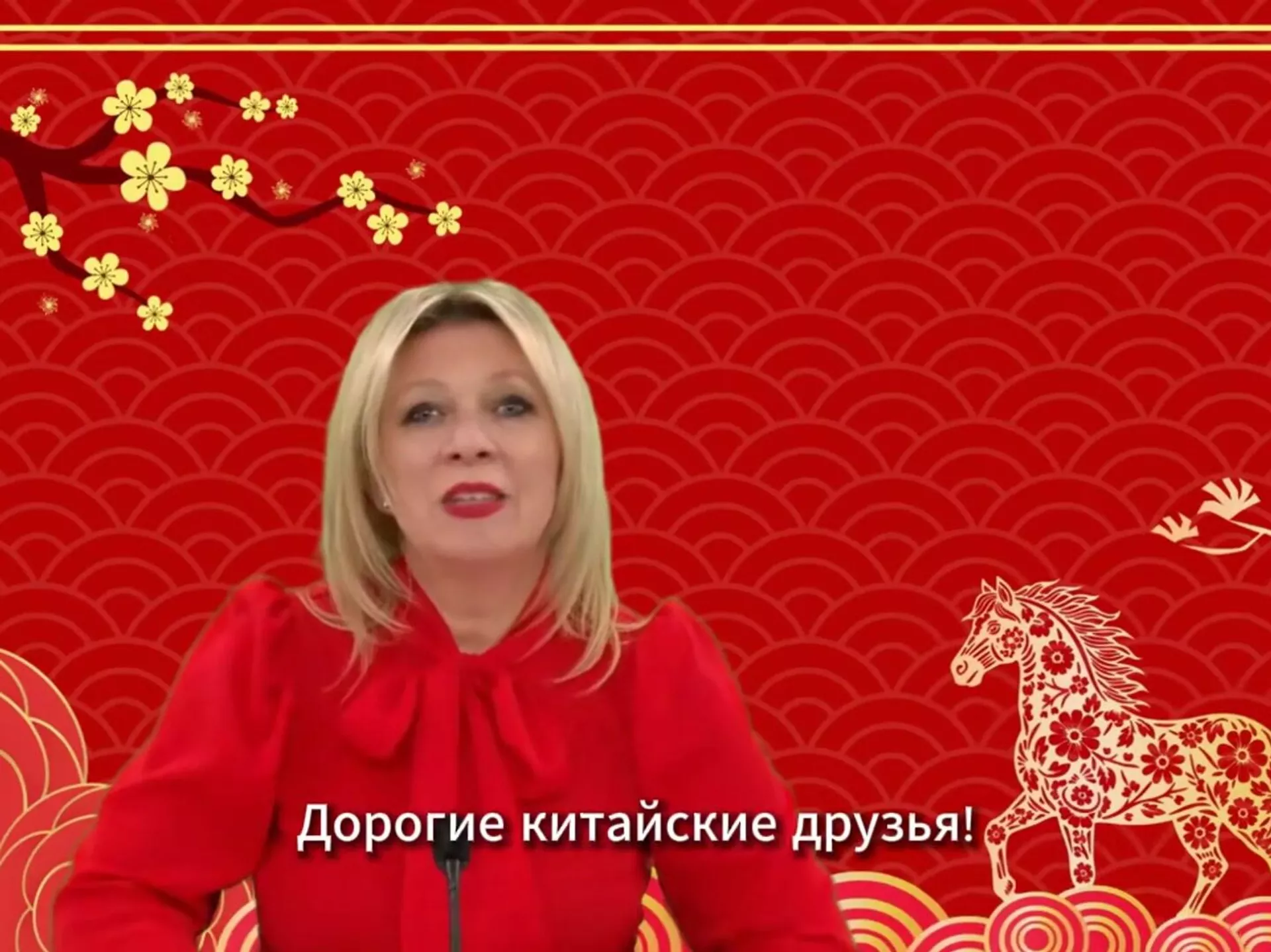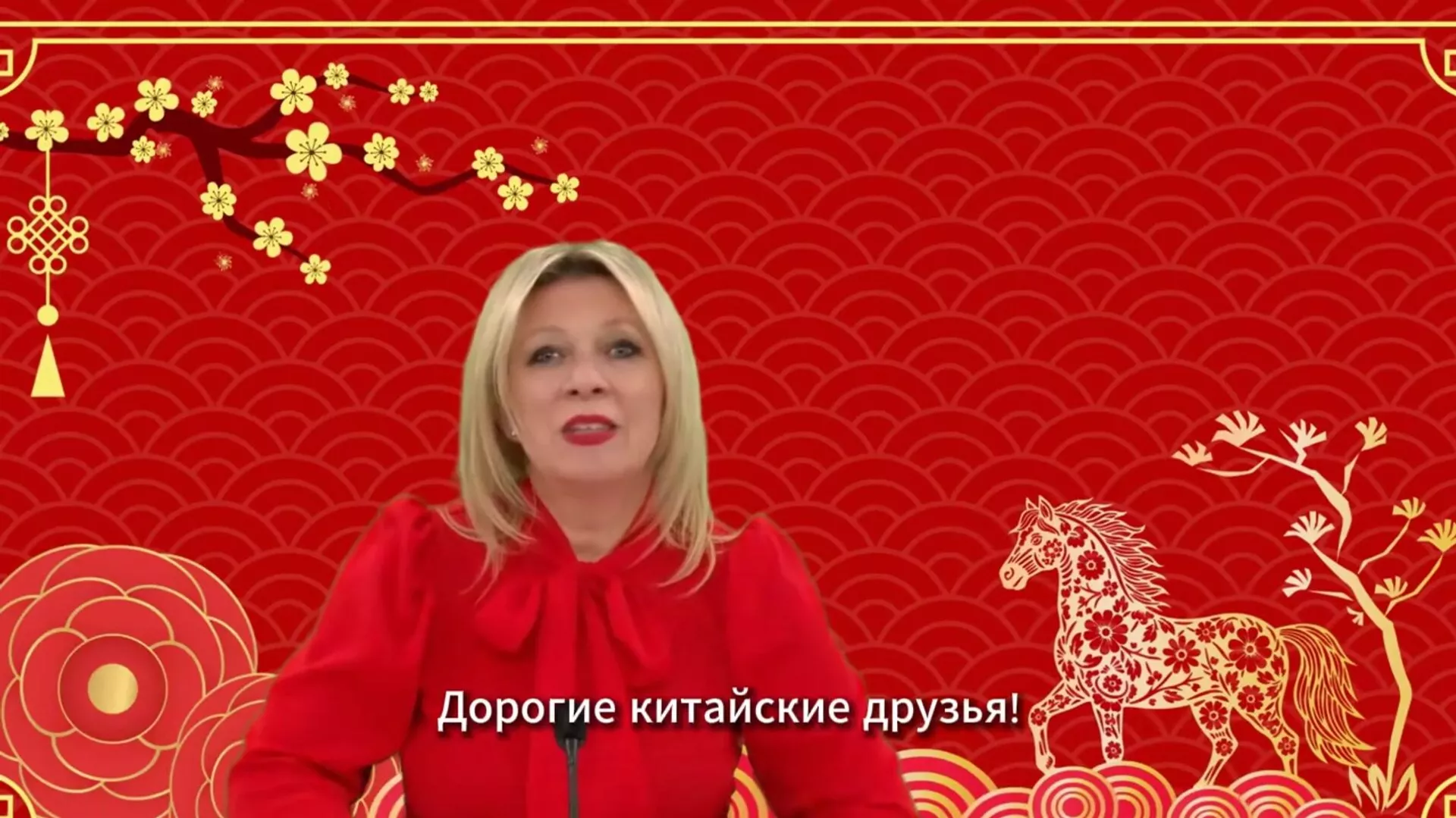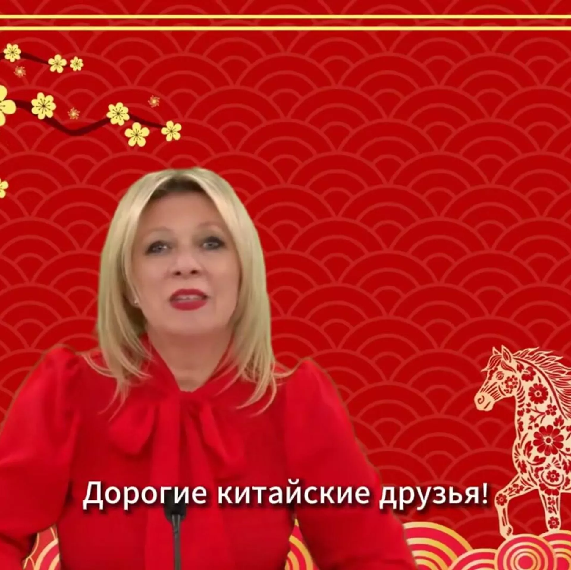 «Սիրելի՛ չինացի ընկերներ, Ձիու տարվա մուտքն արդեն մոտ է։ Սրտանց շնորհավորում եմ բոլորիդ Գարնան տոնի կապակցությամբ: Մաղթում եմ, որ նոր տարում դուք լցված լինեք էներգիայով, որ ամեն ինչում առաջինը լինեք, որպեսզի հաջողությունն ակնթարթային այցելի ձեզ», – իր տեսաուղերձում չինարենով ասել Է Զախարովան։