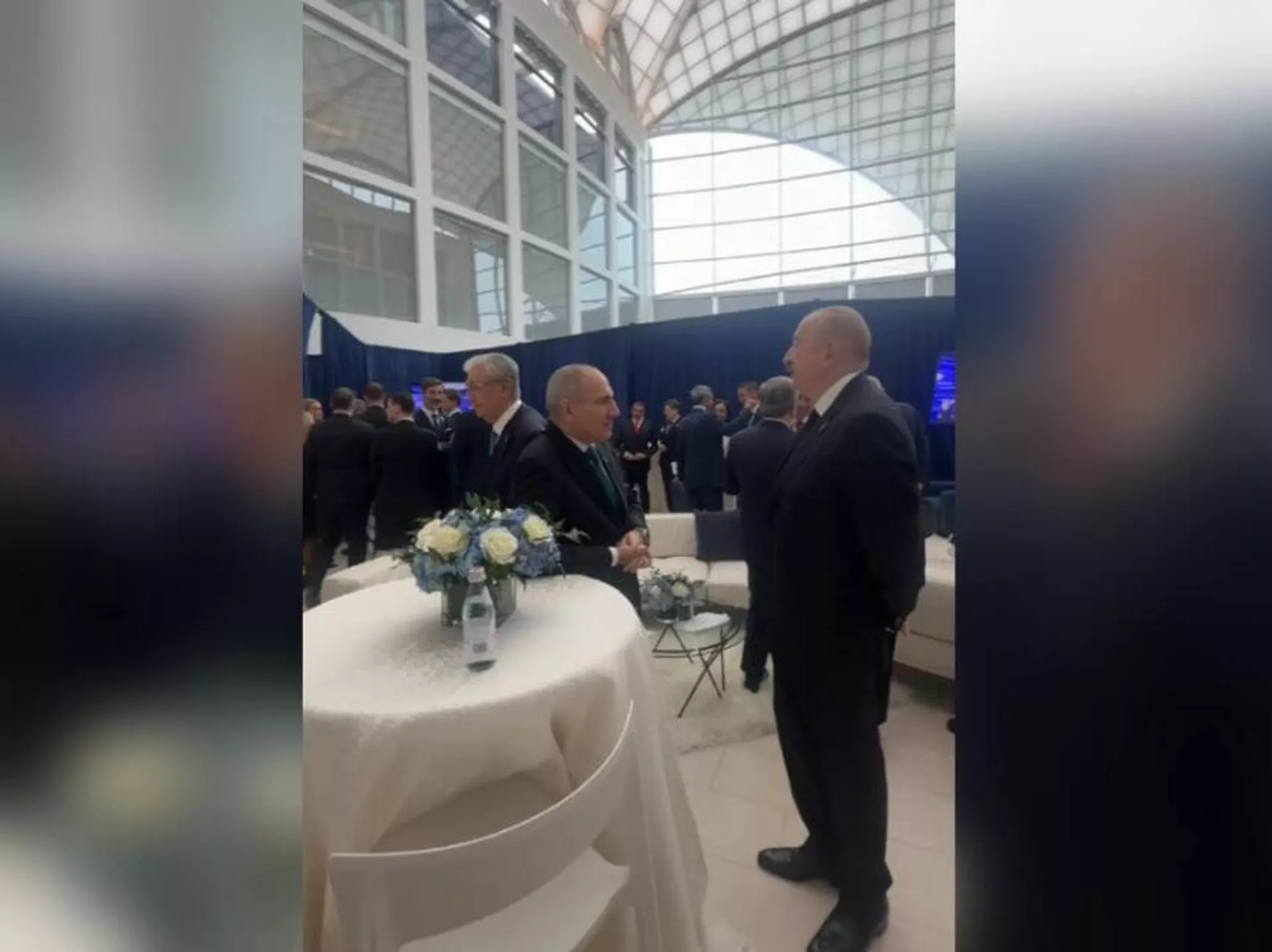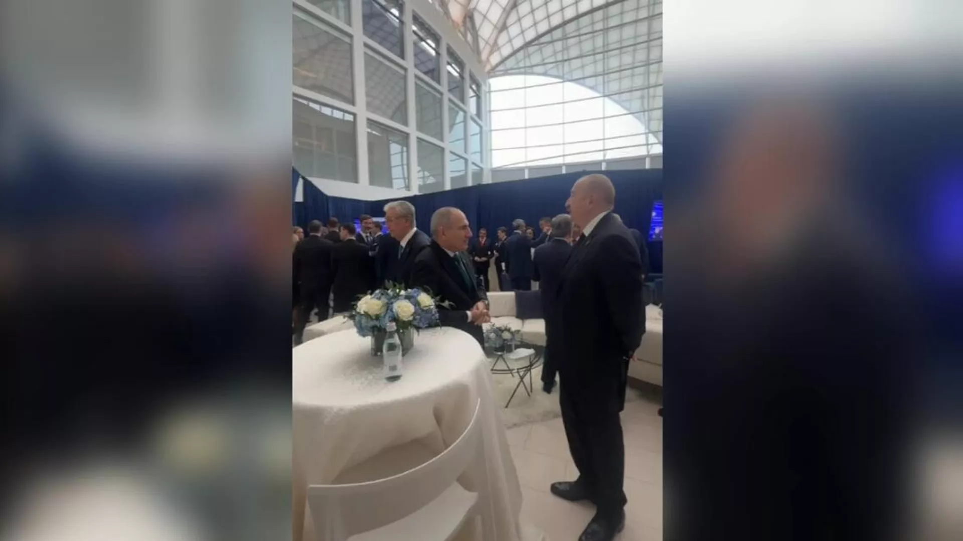 Կադրերում երևում են նաև Ղազախստանի և Ուզբեկստանի նախագահները։ Կասիմ–Ժոմարտ Տոկաևը և Շավքաթ Միրզիյոևը նույնպես մասնակցել են զրույցին: